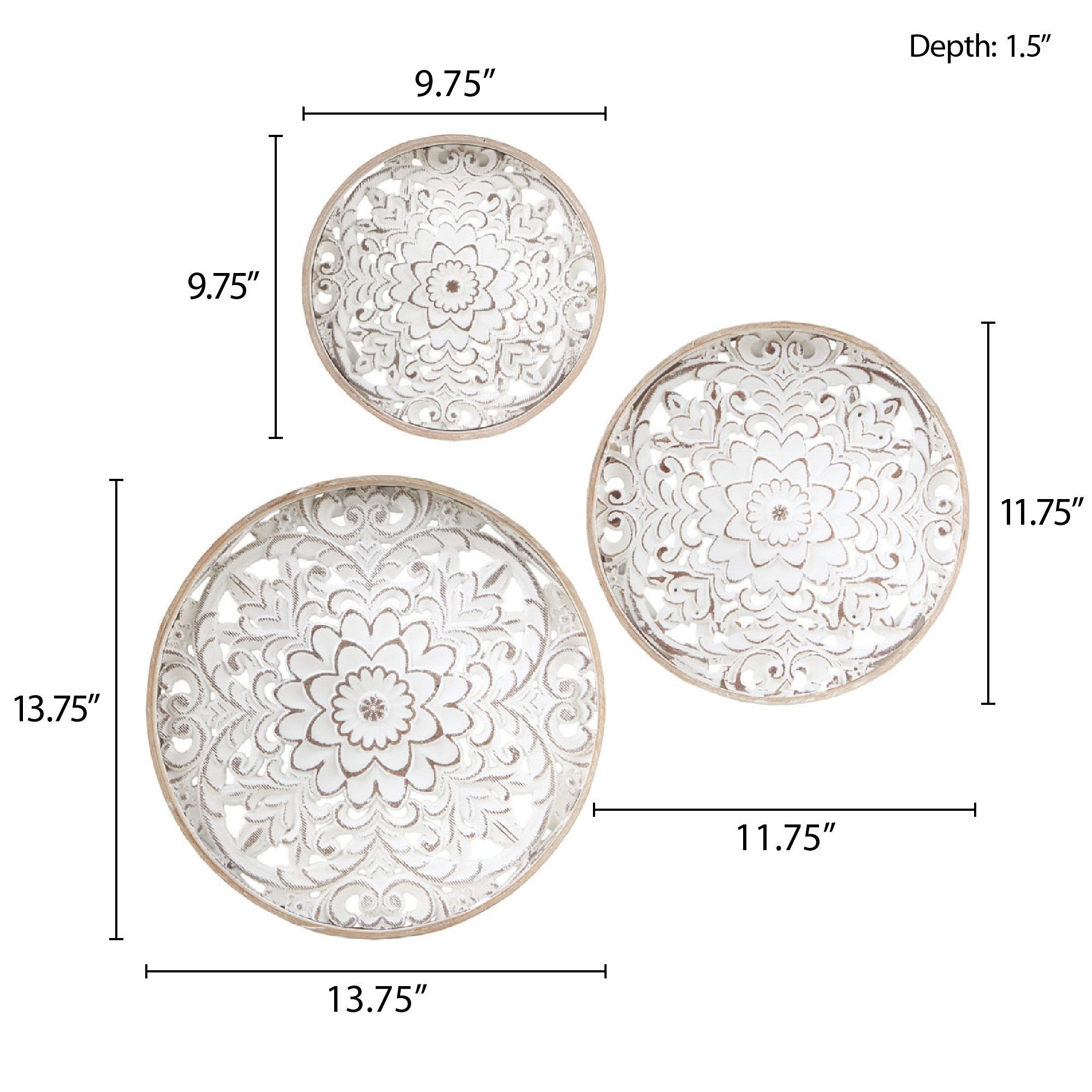 Update any room in your home with our Madison Park Medallion Trio Distressed White Floral 3-piece Carved Wood Wall Decor Set. Each round piece features a 100% fir wood frame with an intricate white wood medallion design in the center, for a vintage and globally inspired look. A Sawtooth hanging fixture on the back makes each wall art piece easy to hang. With so many options - arrange this 3 piece wall decor set any way you desire to suit any small size space and add that perfect charming touch!
