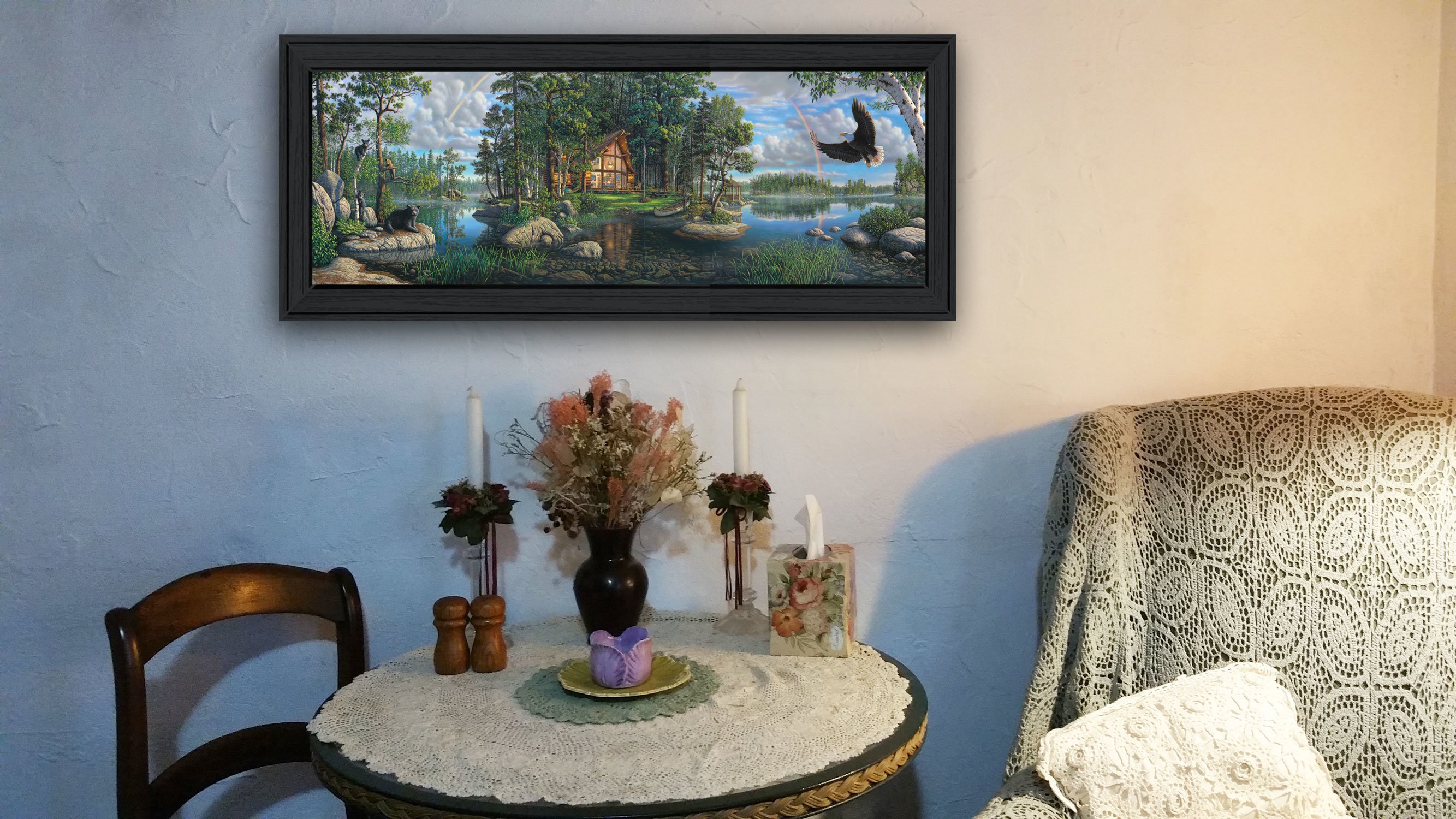 NFA101-405 Freedom's Promise Trilogy by artist Kim Norlien, in a decorative 39 x 15 black frame. A beautiful wilderness landscape with a lodge on an island with a rainbow overhead. There are black bears and cubs on the left playing in the trees, and an eagle flying to the right of the lodge. There's a canoe and gazebo near the lodge. Arrives ready to hang. •TEXTURED ARTWORK with a 'rolled on' acid-free acrylic coating to create a canvas painting effect.•UV PROTECTANT COATING protects artwork from fading. No glass is necessary.• MOULDING adds natural beauty to the framed art. Frame is keyholed for the easy hanging.•THIS FINE HOME DECOR piece made in the USA by Woman Owned Business (WBE) is a perfect gift for a friend or relative.