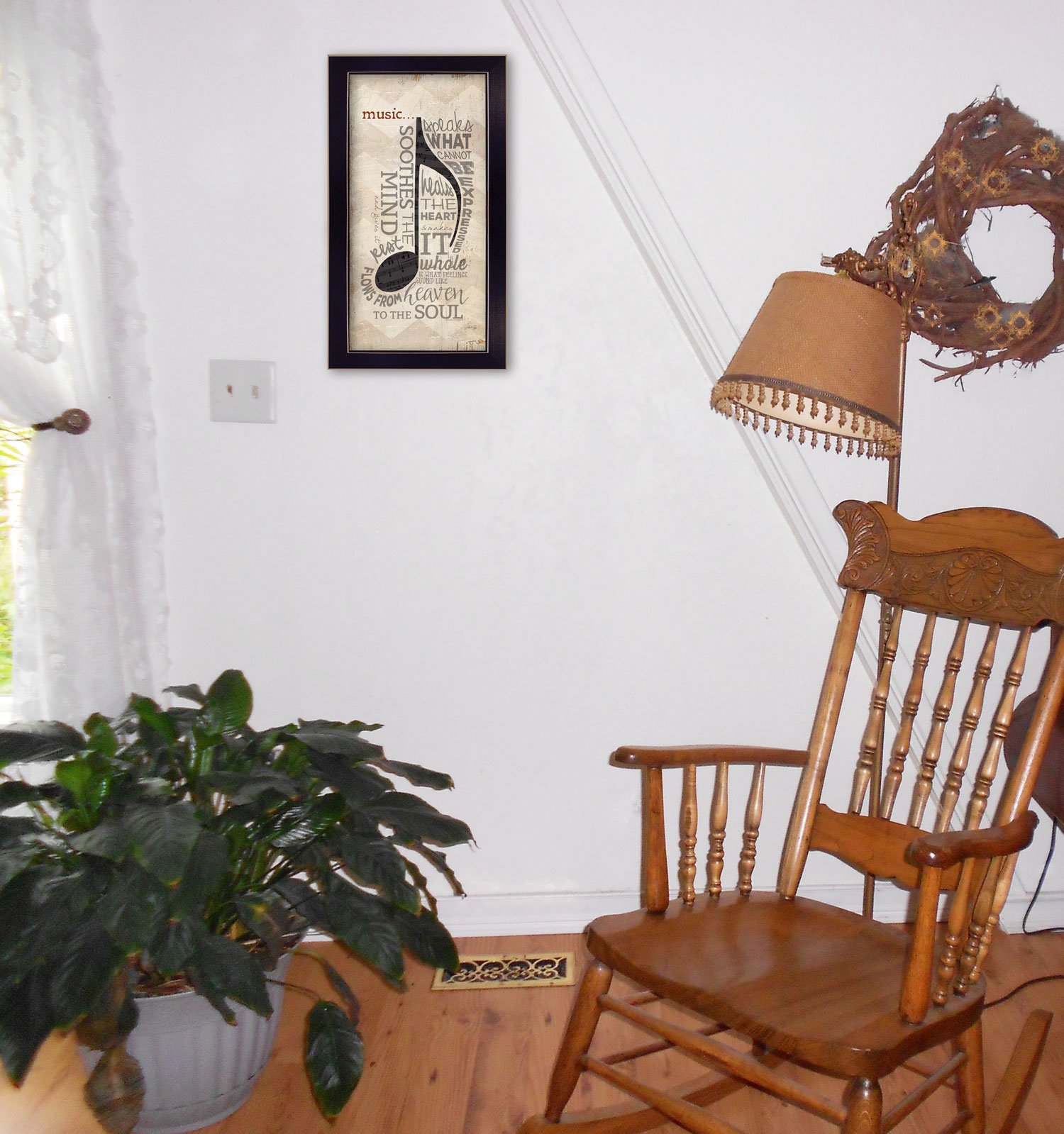 Music is a 11"x20" framed print by artist Marla Rae. This artwork features a musical note and describes what music can do for you. This print is textured and ready to hang.•Women Owned (WBE)•Textured Artwork with a 'rolled on' acid free acrylic coating to create a canvas painting effect. No glass is necessary.•UV protectant coating protects artwork from fading.•MDF moulding adds natural beauty to the framed art. Frame is keyholed for ease of hanging.